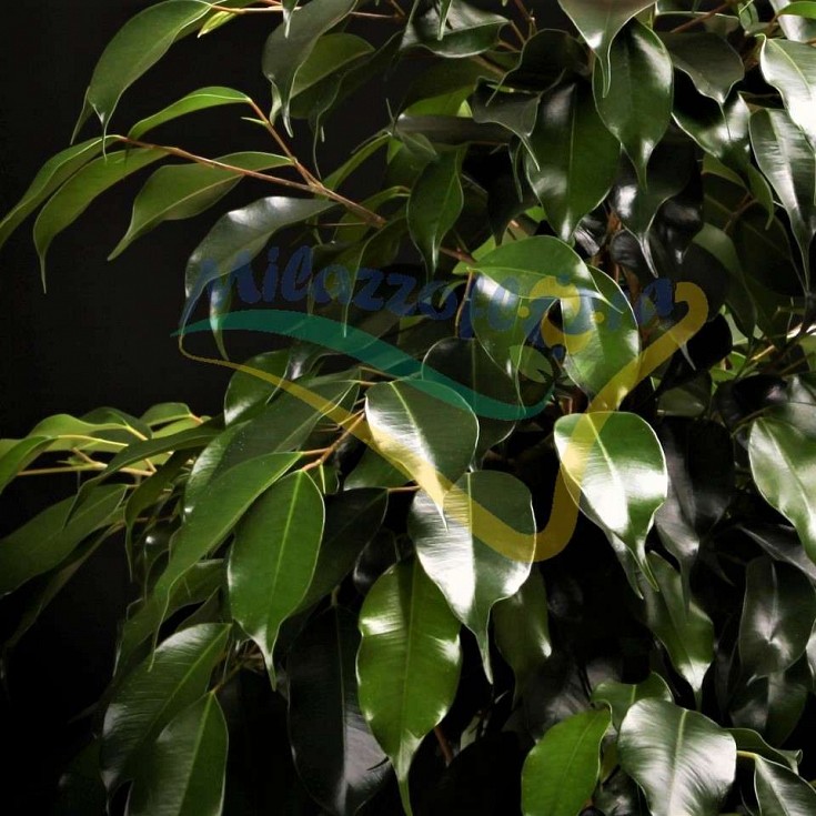 La Ficus benjamina L. (1767) es un árbol siempreverde, alto hasta cerca 20 m con tronco de hasta 50 cm de diámetro, con corteza lisa de color blanco grisáceo y copa amplia con eventual producción de raíces aéreas de las ramas principales; las jóvenes ramas son péndulas. Las hojas, más bien coriáceas, sobre un corto pecíolo, son alternas, de forma de ovada a elíptica con margen entero y ápice acuminado, largas 3-10 cm y anchas 2-5 cm, de color verde oscuro brillante superiormente.
