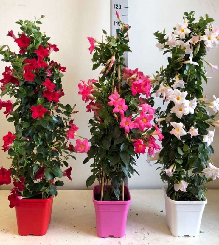 Los Sundeville son híbridos comerciales (Mandevilla sanderi) más resistentes a la luz total ya las bajas temperaturas.