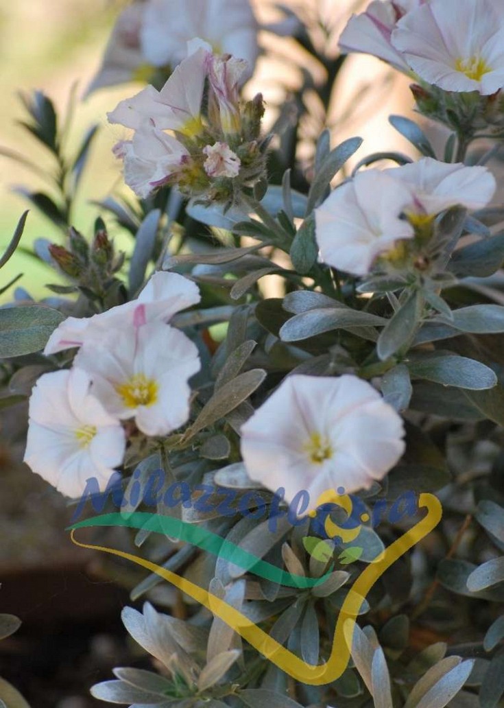 Convolvulus cneorum, also known as silverbush or shrubby bindweed, is a species of flowering plant in the family Convolvulaceae, which contains many plants described as "bindweed". Unlike other species in the genus, it is an evergreen shrub rather than a vine, forming a low mound 0.6–1.2 m (2 ft 0 in–3 ft 11 in) in height, with a similar spread. It produces 2.5–4 cm (1–2 in) diameter flowers which are white with a yellow throat. These are produced at the end of stems in loose panicles and may almost completely cover the plants. The leaves are grey-green and are covered in fine hairs which give the plant a silvery appearance.