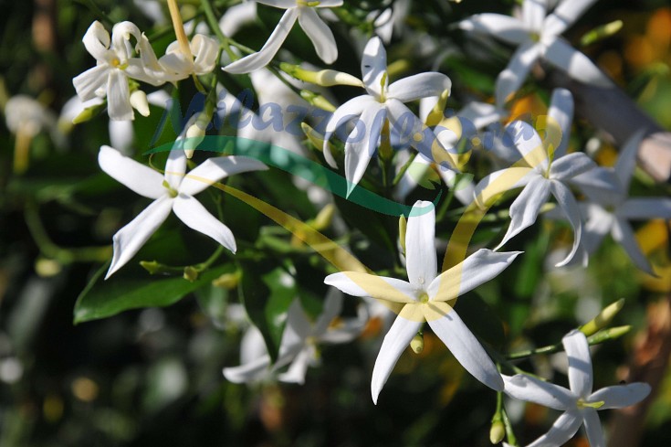 is an evergreen, sarmentose, shrub, much ramified with pendulous branches, long up to more than three metres. The leaves are opposite, trifoliate, with ovate leaflets, rather coriaceous, glossy dark green, with wavy margin and pointed apex, the terminal one being bigger than the lateral ones, 4-8 cm long and 2-4 cm broad. The inflorescences are in axillar and terminal cymes, carrying numerous flowers, gently scented, with 2-2,5 cm long calyx, equipped with 4-5 triangular, 1 mm long, teeth, white corolla with 1-1,5 cm long tube and 4-5 oblong lobes, pointed at the apex, 1-1,5 cm long and 0,5 cm broad.