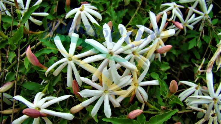 Strongly branched from the base and with a dense and compact appearance, it bears small elliptical dark green leaves that form the background of a generous flowering between the end of spring and the beginning of summer (June-August). The latter is made up of large pure white flowers that are intensely perfumed and whose corolla can also present 12 petals. The buds, on the other hand, are characteristically dyed red and just as decorative.