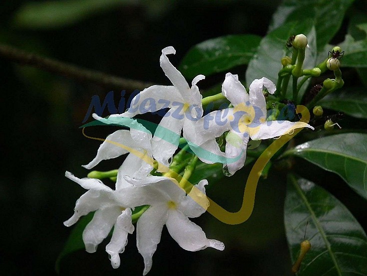 Tabernaemontana divaricata est un arbuste à feuilles persistantes de la famille des Apocynaceae, atteignant environ 4 m de haut, avec des ramifications dichotomiques et une sève laiteuse. Les feuilles, sur un pétiole de 0,4-1 cm de long, sont opposées, simples, oblongues-lancéolées, avec un sommet long et pointu et un bord entier légèrement ondulé, de 7-15 cm de long et de 2-4 cm de large, de couleur vert intense et lustrées. dessus, opaque dessous et côtes saillantes. Les inflorescences, à l'aisselle des bifurcations supérieures des branches, sont des pics portant 2-10 fleurs de 3-5 cm de diamètre qui sentent la nuit. Il fleurit entre mars et septembre. Les fruits sont des follicules en une paire oblongue avec une extension en pointe courbée, de 4 à 7 cm de long et de 0,8 à 1,5 cm de diamètre, contenant de nombreuses graines recouvertes d'un arille rouge.