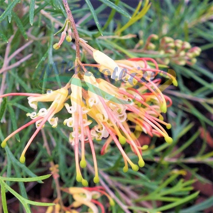 Grevillea x semperflorens ist eine Hybride, deren Eltern G. thelemanniana und eine gelbblütige Form von G. juniperina sein sollen.