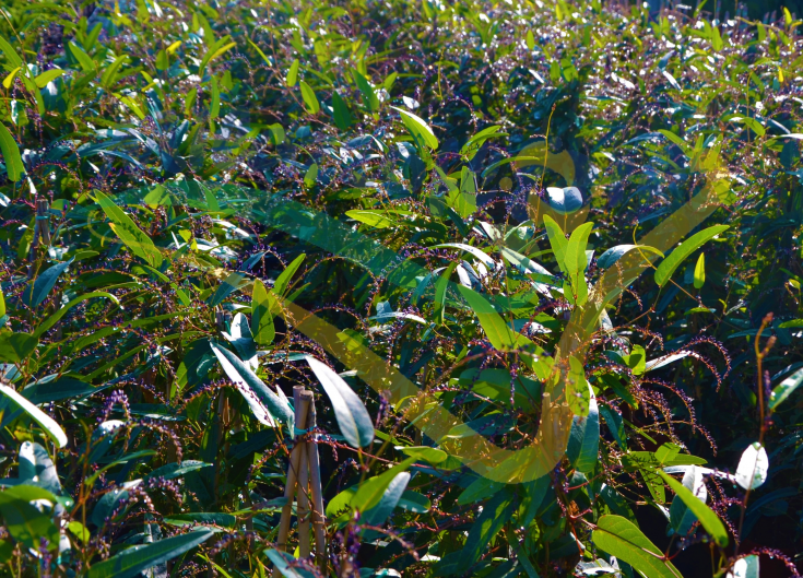 seine Laub ist hartnäckig, bestehend aus langen abwechselnden Blättern, 8 bis 10 cm, oval lanzettlich, dunkelgrün geadert mit hellgrün. Diese Blätter werden von langen, viereckigen, braunen, eher zerbrechlichen Stämmen getragen. die Blüte Frühling, vom Ende des Winters bis Mai, von Hardenbergia violacea, ist großzügig, nektarhaltig und gesund. Es besteht aus Cluster etwa dreißig kleine Blüten, oft violett-lila, die sich allmählich von oben nach unten in den Blütenstand öffnen.