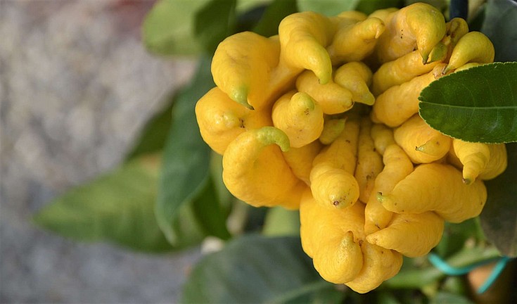 Die Zitronat-Zitrone Buddha's Hand' (Citrus medica 'Digitata', Citrus medica var. sarcodactylis) stammt vermutlich aus dem östlichen und südöstlichen Asien. In China und Japan ist sie bis heute weit verbreitet und wird für religiöse Zeremonien eingesetzt. Kein Wunder, denn die Fruchtform ist nicht das einzig Ungewöhnliche: Die Fruchtschalen duften sehr intensiv wie ein facettenreiches süß-blumiges Parfum, das man zunächst gar nicht einer Zitrusfrucht zuordnen würde. Die Blüten sind groß (3,5-4 cm) und ihre Knospen wie die jungen Blätter von einem violetten Schimmer überzogen. Die Hauptblüte fällt in Kübelkultur zumeist in die Frühlings- oder Spätsommermonate, wobei auch im Sommer Blüten auftreten können.