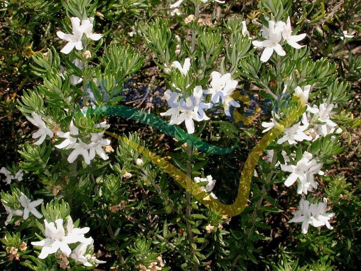 Die Blüten sind weiß, behaart und haben das obere Blütenblatt in zwei Lappen geteilt. Sie haben auch orangefarbene Flecken auf ihrer unteren Hälfte. Dieser Strauch ist sehr zäh und wächst auf Klippen direkt am Meer.